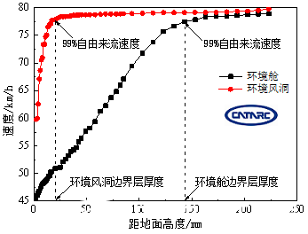 圖2 距風(fēng)洞噴口和環(huán)境艙風(fēng)機(jī)出口1m處邊界層厚度對比(目標(biāo)風(fēng)速80km/h)