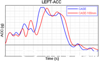 下圖是某款車型不同前艙吸能空間的影響分析,其中車型1較車型2增加了100mm的縱梁長度。經過計算分析,可以看出,前艙空間加大100mm后,車體及壁障加速度均出現了不同程度的緩和,碰撞歷程更長。壁障的OLC指標從39g降低到了36g。