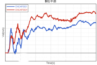 2024版C-NCAP正碰工況由50km/h速度提升到了不低于55km/h碰撞速度。碰撞總能力提高了20%。這對前艙結構吸能提出了更大的挑戰。下圖是采用滿足2021版C-NCAP正碰開發需求的車型,進行2024版C-NCAP正碰分析對比結果。可以看出,碰撞速度提升后,前艙被擠壓的量更大、前圍入侵超過了100mm,B柱加速度提高了10g。因此2021版C-NCAP正碰結構設計,并不能滿足2024版C-NCAP正碰開發需求。