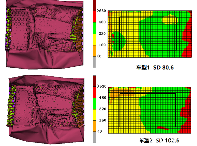 下圖是兩款不同結構車型的SD計算結果,其中車型1為含副車架傳力結構,車型2為不含副車架傳力結構。可以看出,增加副車架傳力通道后,SD指標可以從100mm降至80mm,改善效果非常明顯。
