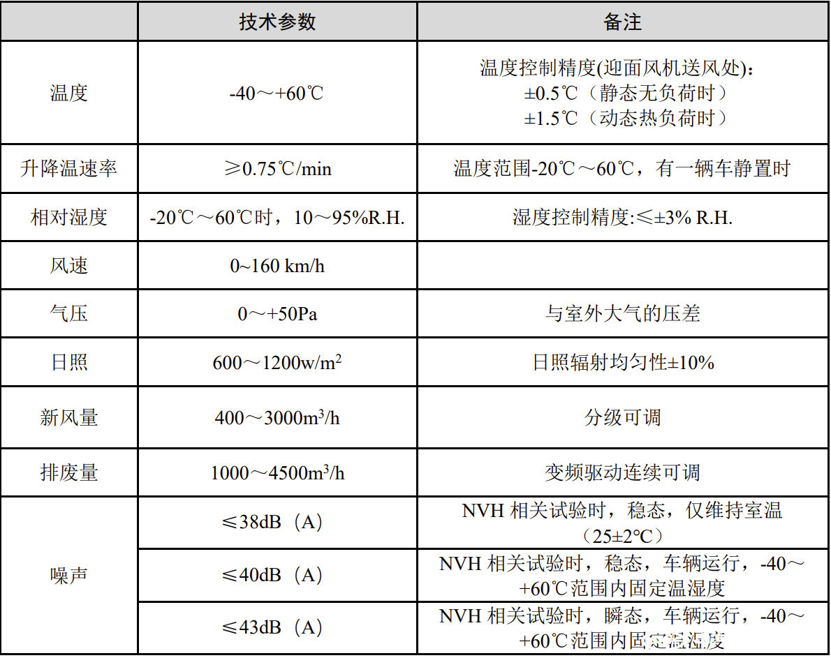 整車氣候環境模擬NVH半消聲實驗室,主要包括環境艙體、溫濕度控制系統、空氣循環系統、新風系統、光照模擬系統、安全報警系統及控制系統等。可為兩輪或四輪驅動的總質量不超過5000kg的輕型車,提供模擬溫度-40℃~+60℃、 濕度10%~95% R.H.、陽光和噪聲的試驗測試環境,可實現車輛的NVH、制動、熱管理及空調性能的開發研究試驗中所有氣候環境的模擬,配合測功機進行VDA、98/69/EC70/220/EEC、EPA CFR-2014-title40(FTP 75、SFTP)、WLTP等法規的試驗。同時可滿足各類輕型車不同氣候環境下的動力NVH性能、空調NVH性能、高低溫啟停NVH性能等試驗的要求,試驗室主要參數如下: