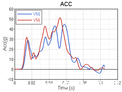 正面 100%重疊剛性壁障碰撞試驗(yàn),碰撞速度由2021版的50km/h(-1,1)提升到55km/h(0,1),碰撞能量增大了21%,從現(xiàn)有車型56km/h正碰可以看出,碰撞速度提升后車體加速度峰值增大,峰值和脈寬時(shí)間提前,前圍板侵入量也明顯增大,對(duì)乘員保護(hù)極為不利。