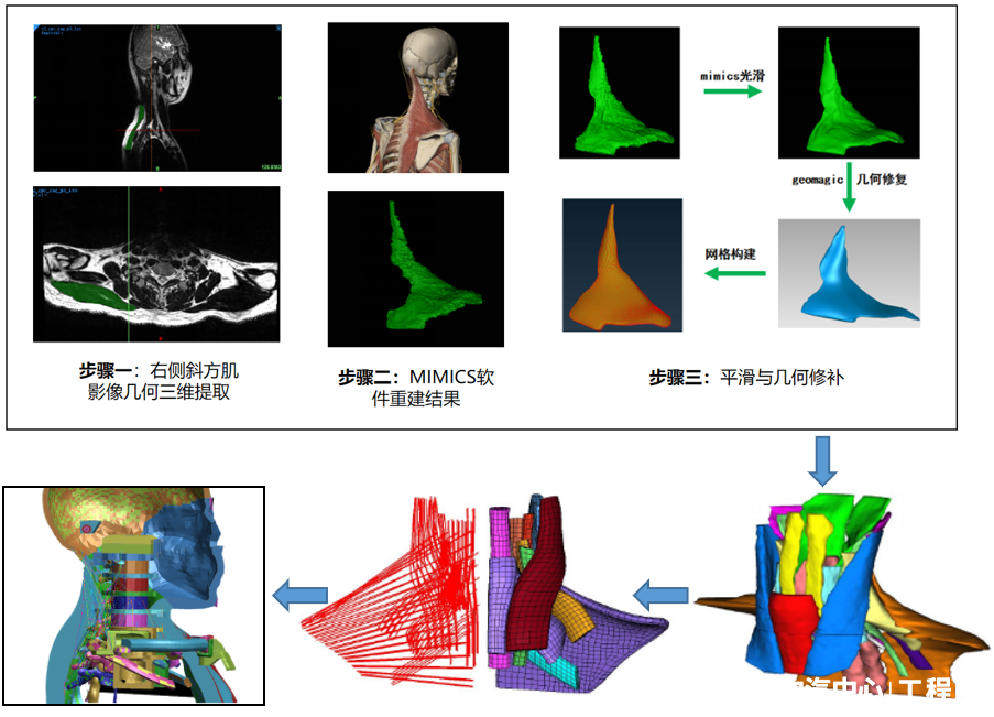 主動式人體有限元模型采用了被動有限元模型與主動控制模型耦合的方法,解決實際情況中骨骼肌等效問題。通過CT掃描獲得層厚0.625mm人體圖像,結合有限元方法構建高度仿生的人體肌肉被動有限元模型,通過輸入實際采集的肌肉激活曲線結合PID控制策略,模擬肌肉收縮搭建主動控制模型,最后對耦合模型適用性進行對標驗證,模型的頭部、肩部、頸部的離位姿態均與實驗數據高度吻合。