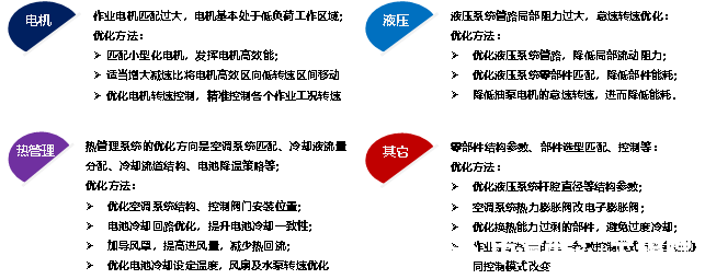 通過對整機能量管理仿真結果和能量流測試數據的綜合分析,針對整機電驅系統、熱管理系統、液壓系統、控制系統等,提出了多種切實可行的能耗優化措施,如熱管理系統的架構優化、熱管理控制策略優化、液壓系統管路結構優化、電機匹配優化及工作轉速優化、液壓控制策略優化等,不僅提升了整機作業系統的性能,還顯著降低了整機行駛和多工況作業的能耗。