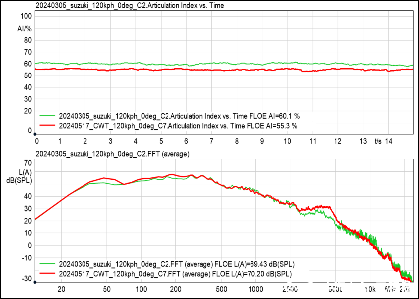 以同一輛車為試驗對象,分別在氣動聲學風洞和環境風洞開展120km/h風速工況下測試,以車內聲學人工頭左前外耳為噪聲基準測點。得出: