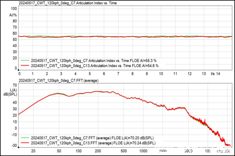 3、環境風洞重卡風噪試驗數據一致性良好,相同工況兩組數據差值A計權聲壓級0.1dB(A)以內,語音清晰度指數差值(AI)0.3%以內。能夠精確排查方案貢獻量。