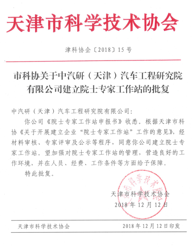 近日,天津市科學技術協會下發《市科協關于中汽研(天津)汽車工程研究有限公司建立院士專家工作站的批復》(津科協企[2018]15號),批準建立中汽研(天津)汽車工程研究院有限公司(以下簡稱“中汽研公司”)院士專家工作站。