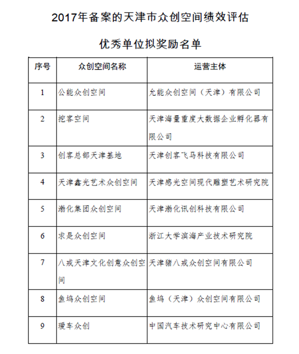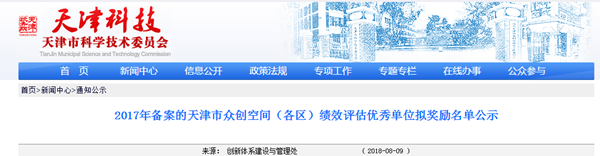 近日,天津市科委開展了2018年眾創空間績效評估工作。經過專家評審等程序,璦車眾創被評為“天津市眾創空間(各區)績效評估優秀單位”。