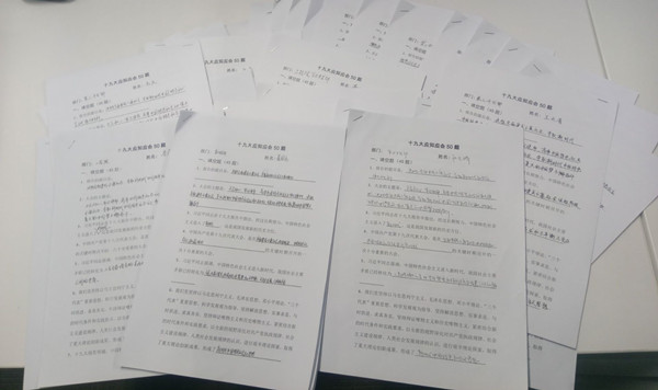 測試試題包括填空題和簡答題兩大部分共50道題,內容涵蓋了黨的十九大報告的核心論斷,通過本次知識測試活動,大家紛紛表示要增強學習的主動性和積極性,學以致用,進一步深刻領會黨的十九大精神實質。